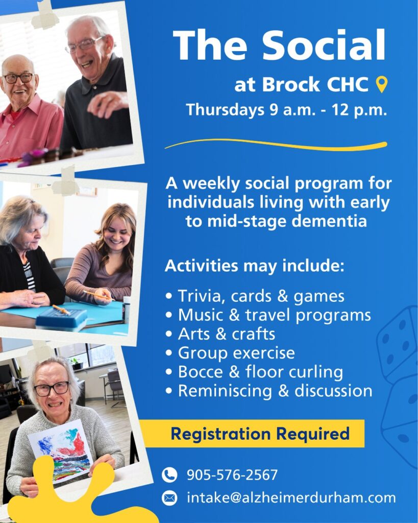 As well, The Social is running at Brock CHC and there are still spaces available! This weekly program is designed for individuals living with early to mid-stage dementia. It offers a welcoming space to connect with others, engage in activities tailored to participants’ interests, and enjoy time together. Care partners benefit from dedicated respite time while their loved ones participate.